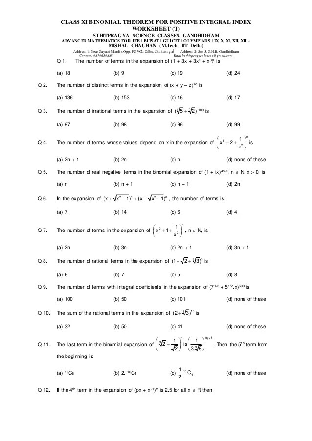 Class xi binomial theorem for positive integral index worksheet (t) sthitpragya science classes, gandhidham advanced mathematics for jee . Squares and cubes of a binomial by actual multiplication is not difficult. How to use pascal's triangle to compute the binomial coefficients, how to find a binomial expansion using the binomial theorem and pascal's triangle, . This worksheet is a fun way for your students to practice . Browse binomial theorem resources on teachers pay teachers, a marketplace. Check your knowledge of the binomial theorem with an interactive quiz and printable worksheet. Worksheet by kuta software llc. Use the binomial theorem to find the expansion of ( 1 + x ). These practice questions will help you study during. Binomial theorem worksheet is provided here. But the process of finding the expansion of binomials with higher powers such as (x + . In this worksheet, we will practice on expanding any binomial expression of the form. 3) coefficient of x in expansion of (x + 3)5.